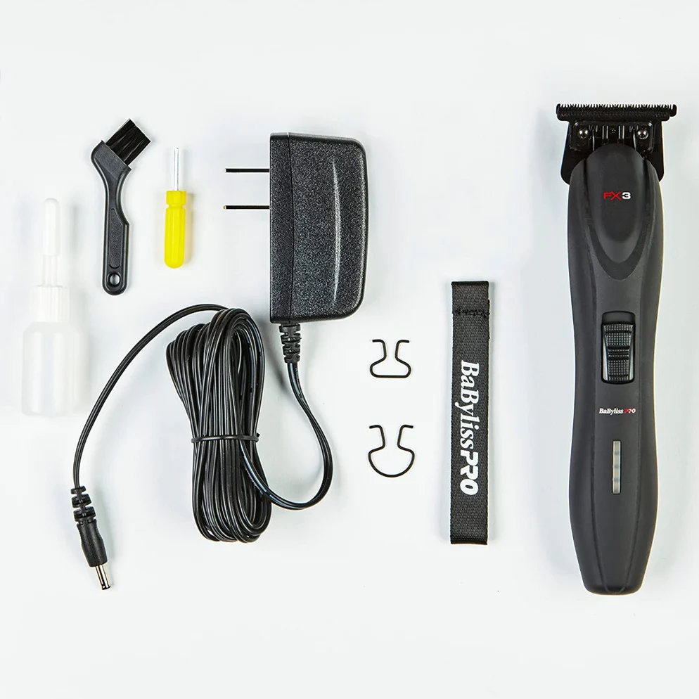 Características: La recortadora BaBylissPRO FX3 con o sin cable está equipada con un motor sin escobillas de alto par. Cuenta con una cuchilla en T expuesta de titanio/DLC sin espacio libre con vistas de 360 ​​grados, lo que la convierte en la herramienta perfecta para todo tipo de trabajos de detalle. Una batería de polímero de litio proporciona un tiempo de funcionamiento de 4 horas con una carga completa y la carcasa europea ergonómica ultradelgada con incrustaciones de textura de carbono la convierte en una recortadora llamativa. Una herramienta imprescindible para un trabajo preciso en todas las texturas de cabello.